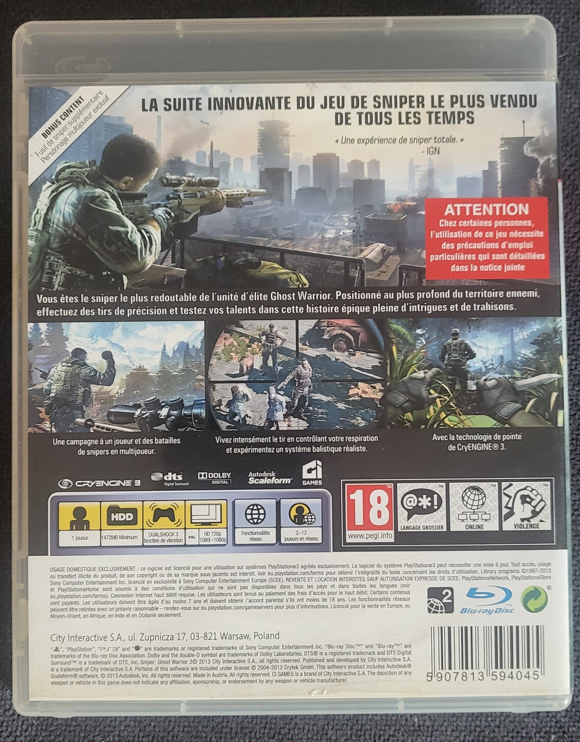 Sniper : Ghost Warrior 2 sur PS3 est un FPS proposant au joueur d'incarner un tireur d'élite, armé d'un fusil de précision et d'une arme de poing à silencieux. Rejoignez un poste d'observation, ajustez votre tir en fonction de la distance et du vent, et dégagez la zone de toute présence ennemie.